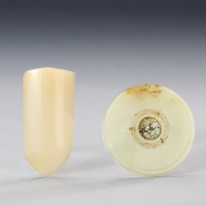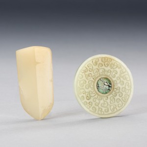 A TURQUOISE-EMBELLISHED WHITE JADE 'CLOUD SCROLL' SWORD HILT POMMEL AND AN AGATE CICADA
