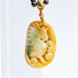 A TRI-COLOUR JADEITE HORSE PENDANT AND A CHAIN OF WOODEN BEADS