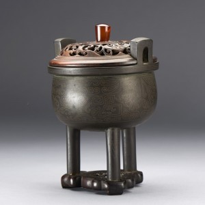 A CHINESE SILVER-INLAID BRONZE TWO-HANDLED TRIPOD CENSER