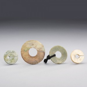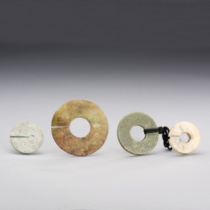 A GROUP OF FOUR JADE DISC, HUAN AND SLIT-RINGS, JUE