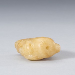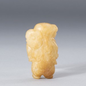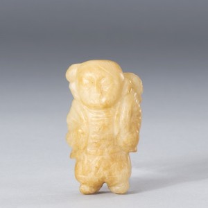 A WHITE AND RUSSET JADE CARVING OF 'BOY HOLDING LOTUS'