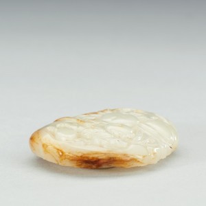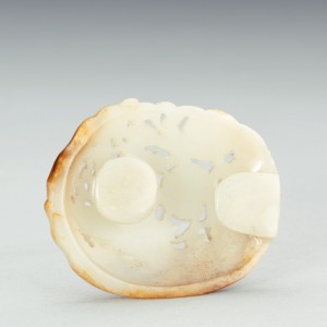 A FINELY CARVED WHITE JADE 'FLOWER ON DECK' BELT BUCKLE