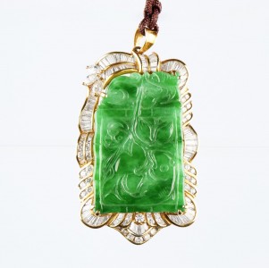 A GOLD-MOUNTED JADEITE AND DIAMOND PENDANTJadeite is approximately 34.72 x 22.00 x 2.00 mmAccompanied with Hong Kong Jade & Stone Laboratory certificate stating that the jadeite is natural, known in the trade as "A jade".