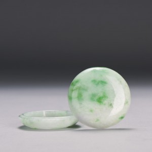 A JADEITE SEAL-PASTE BOX AND COVERDiameter and height of box and cover are 52.69 and 20.74 mm respectivelyAccompanied with Hong Kong Jade & Stone Laboratory certificate stating that the jadeites are natural, known in the trade as "A jade".