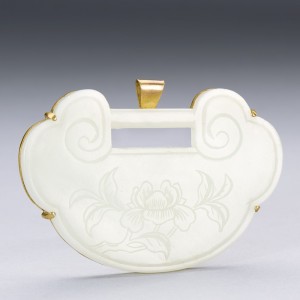 A GOLD-MOUNTED WHITE JADE FLORAL LOCK-FORM PLAQUE