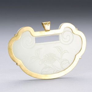 A CHINESE GOLD-MOUNTED WHITE JADE FLORAL LOCK-FORM PLAQUE