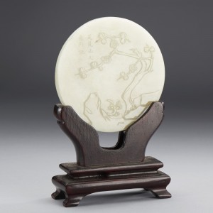 A CHINESE INSCRIBED WHITE JADE CIRCULAR PLAQUE MOUNTED AS A TABLE SCREEN