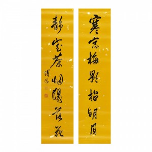 ink on gold-flecked orange paper, set of two, mounted, signed PU RU and with two seals