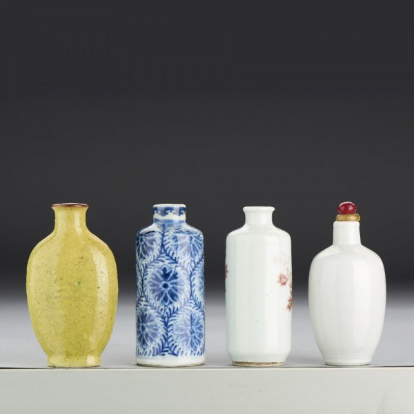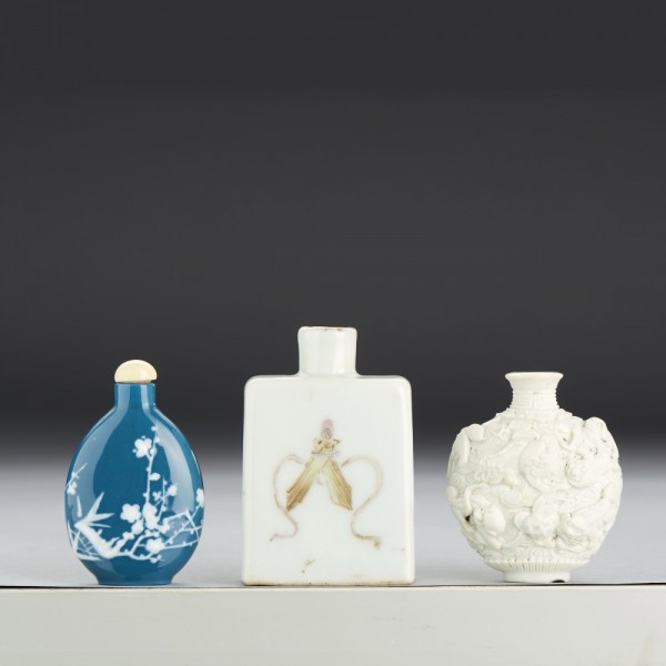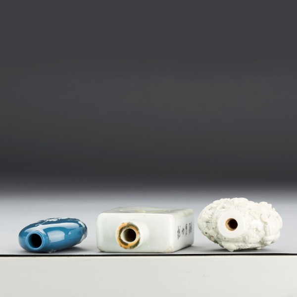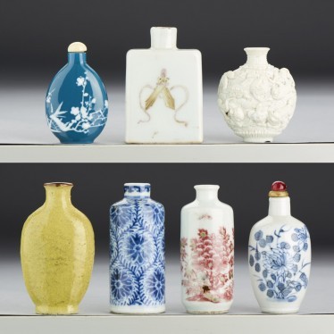 A GROUP OF SEVEN CHINESE 'BLUE AND WHITE' AND PAINTED CHINA SNUFF BOTTLES