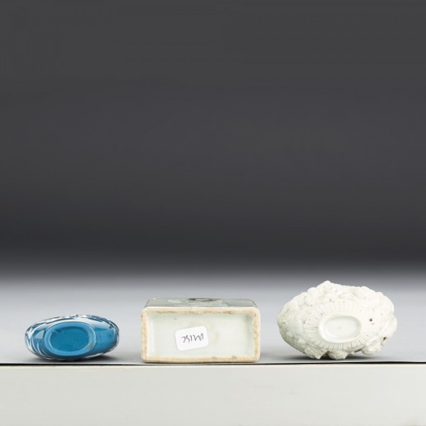 A GROUP OF SEVEN 'BLUE AND WHITE' AND PAINTED CHINA SNUFF BOTTLES