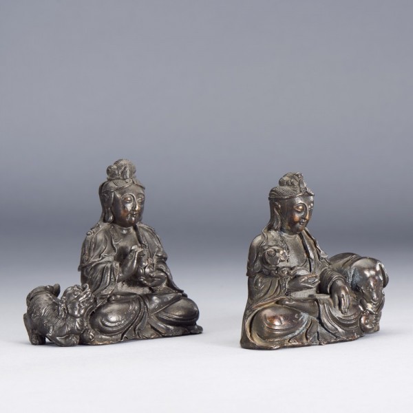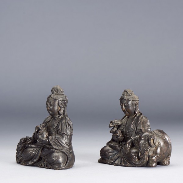 A PAIR OF CHINESE BRONZE SEATED FIGURES OF MANJUSRI BODHISATTVA AND SAMANTABHADRA