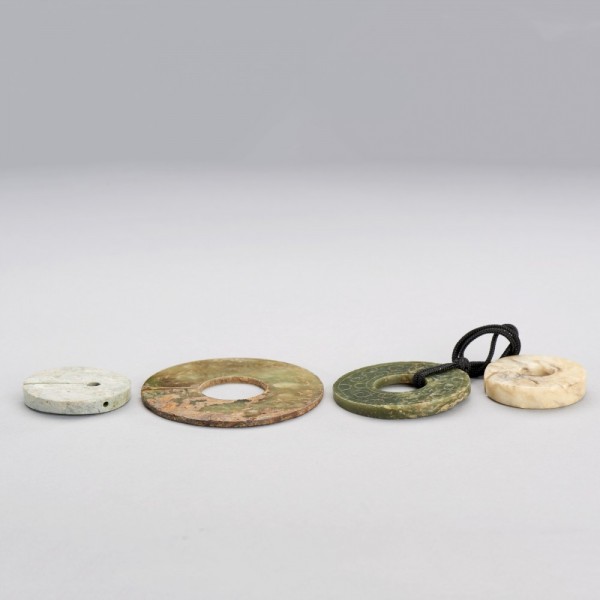 A GROUP OF FOUR JADE DISC, HUAN AND SLIT-RINGS, JUE
