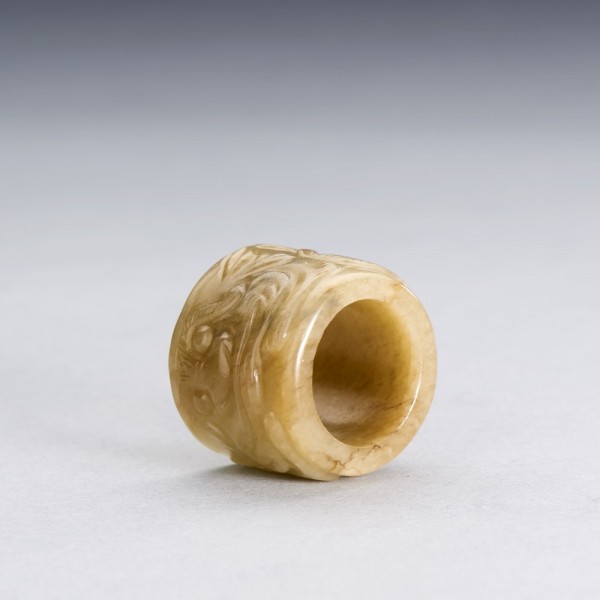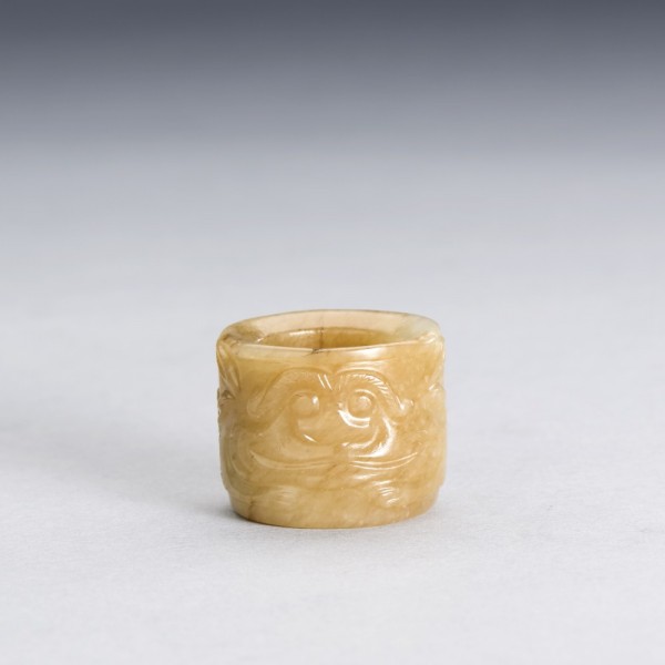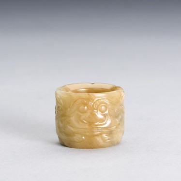 A CHINESE WHITE AND RUSSET JADE 'BEAST MASK' ARCHER'S RING
