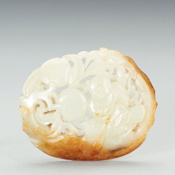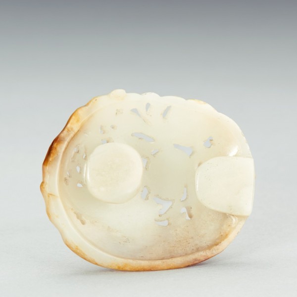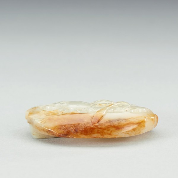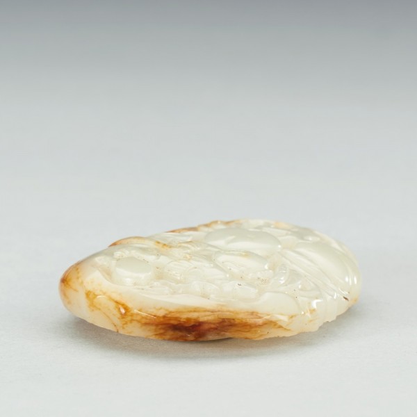 A FINELY CARVED WHITE JADE 'FLOWER ON DECK' BELT BUCKLE