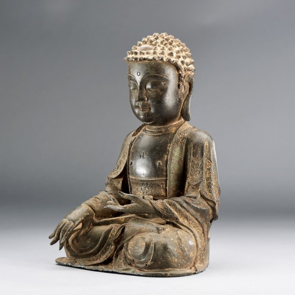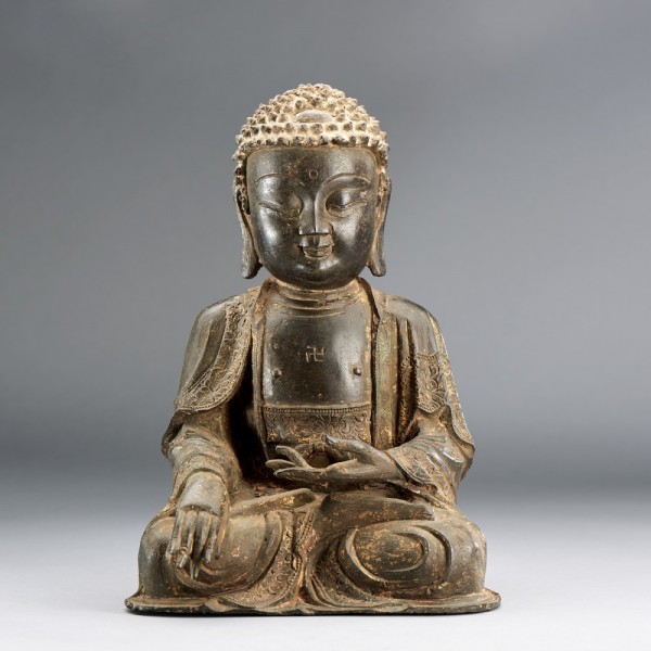 A CHINESE GILT-LACQUERED BRONZE SEATED FIGURE OF SHAKYAMUNI