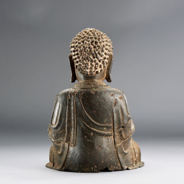 A GILT-LACQUERED BRONZE SEATED FIGURE OF SHAKYAMUNI