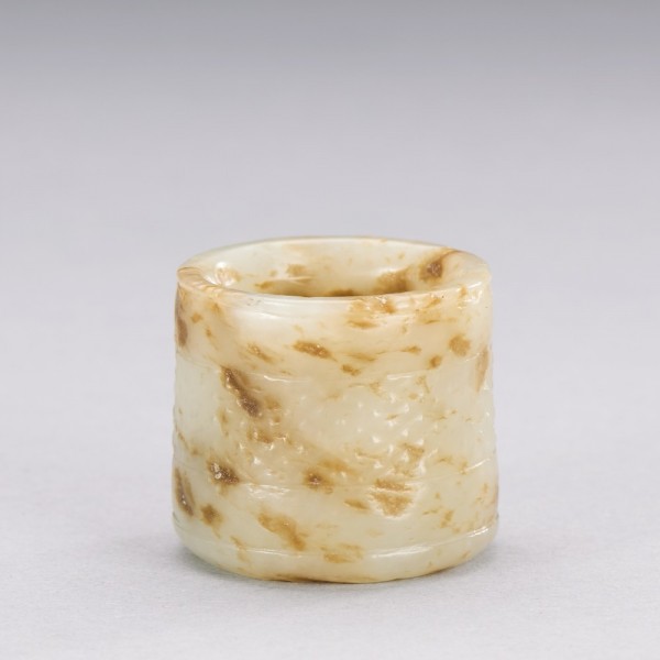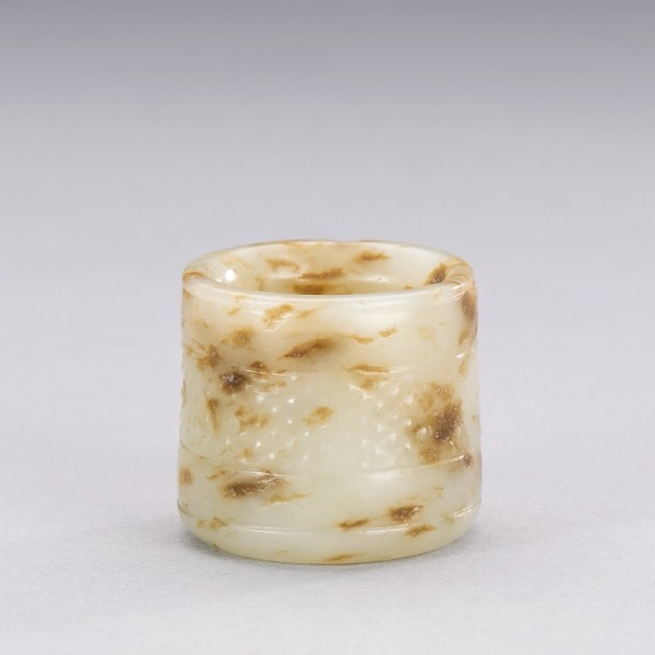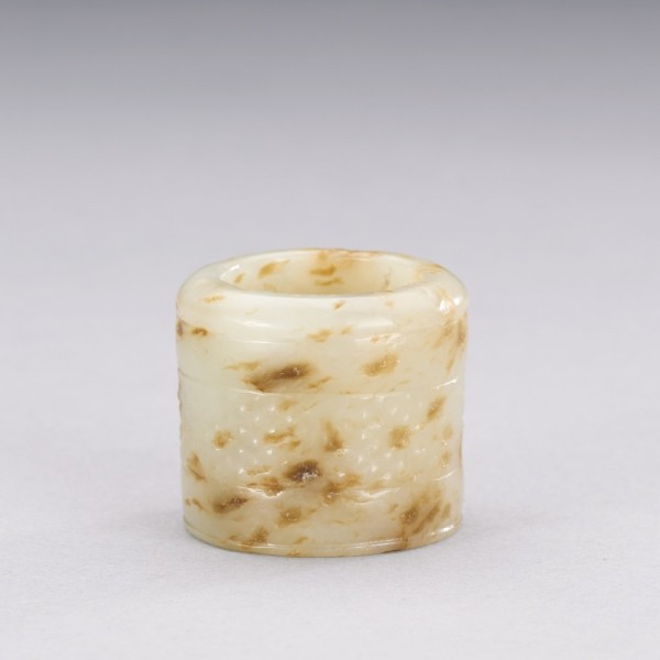 A CHINESE WHITE AND RUSSET JADE ARCHER'S RING