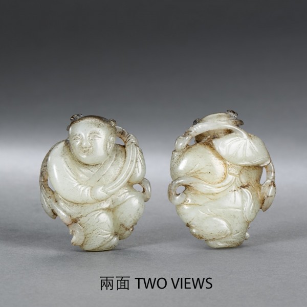 AN UNEARTHED WHITE JADE 'BOY AND LOTUS' PENDANT