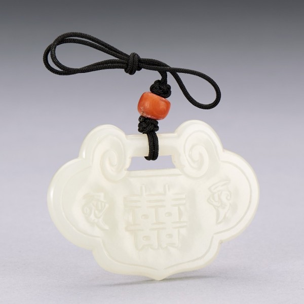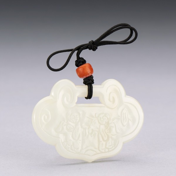 A WHITE JADE 'HEHE ERXIAN' LOCK-FORM PLAQUE