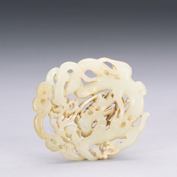 A PIERCED WHITE AND RUSSET JADE DRAGON ORNAMENT