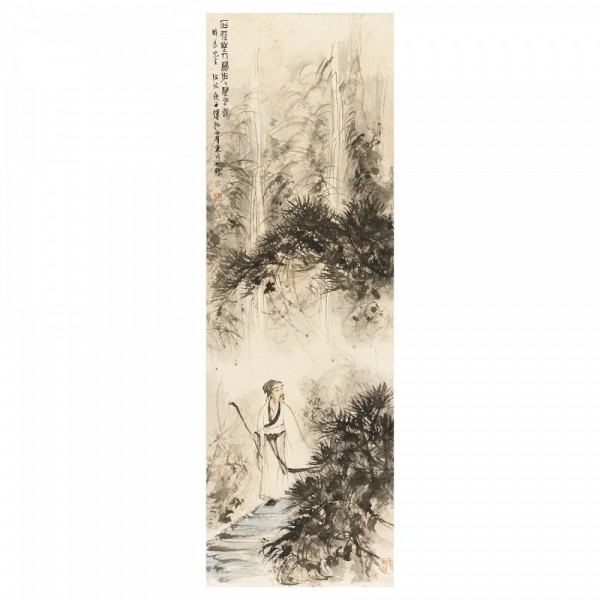 Fu Baoshi (1904-1965)SCHOLARink and colour on paper, hanging scroll, with a dedication, signed FU BAO SHI and with three seals23 x 102 cm (9 1/8 x 40 1/8 in)