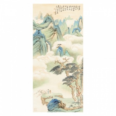Sun Yunsheng (1918-2000)SCHOLARS IN MOUNTAINink and colour on paper, hanging scroll, signed YUN SHENG SUN JIA RUI and with three seals42 x 90.5 cm (16 1/2 x 35 5/8 in)