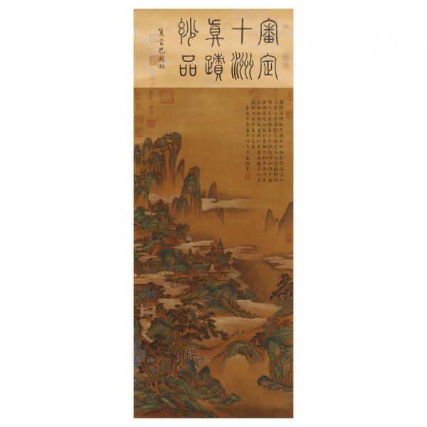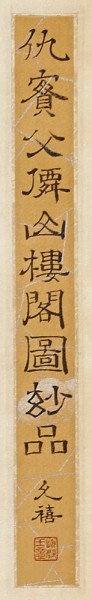 題跋: <董誥> 霧閣消閒脈望飛,月明露重濕珠衣,仙人莫入芙蓉館,花暗迷人不得歸,貌得仙山尺素餘,真形五嶽復何如,地平渤海揚塵後,天啟扶桑御日初,丹鼎河車長命訣,琅函瓊簡列名書,易遷宮似金銀闕,四百年來已定居。嘉慶十年春月初九日董誥書。 <巴慰祖> 審定十洲真跡妙品。雋堂巴慰祖。 <允禧> 仇實父仙山樓閣圖妙品。允禧。 <秦文錦> 仇英仙山樓閣圖立軸,光緒二十三年四月十九日秦文錦重裝。